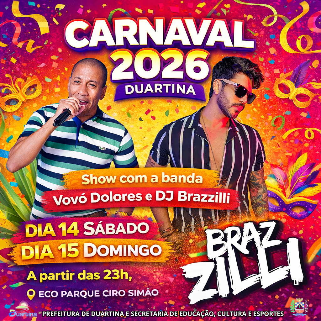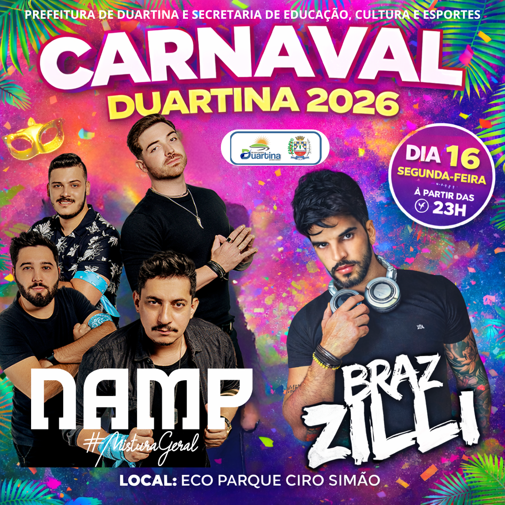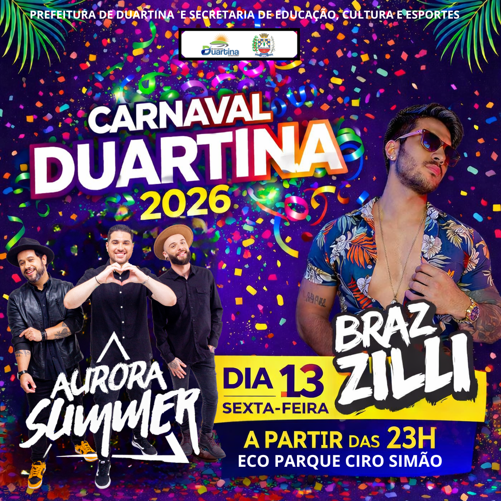 O Carnaval 2026 é uma realização da Prefeitura de Duartina, por meio da Secretaria Municipal de Educação, Cultura e Esportes.