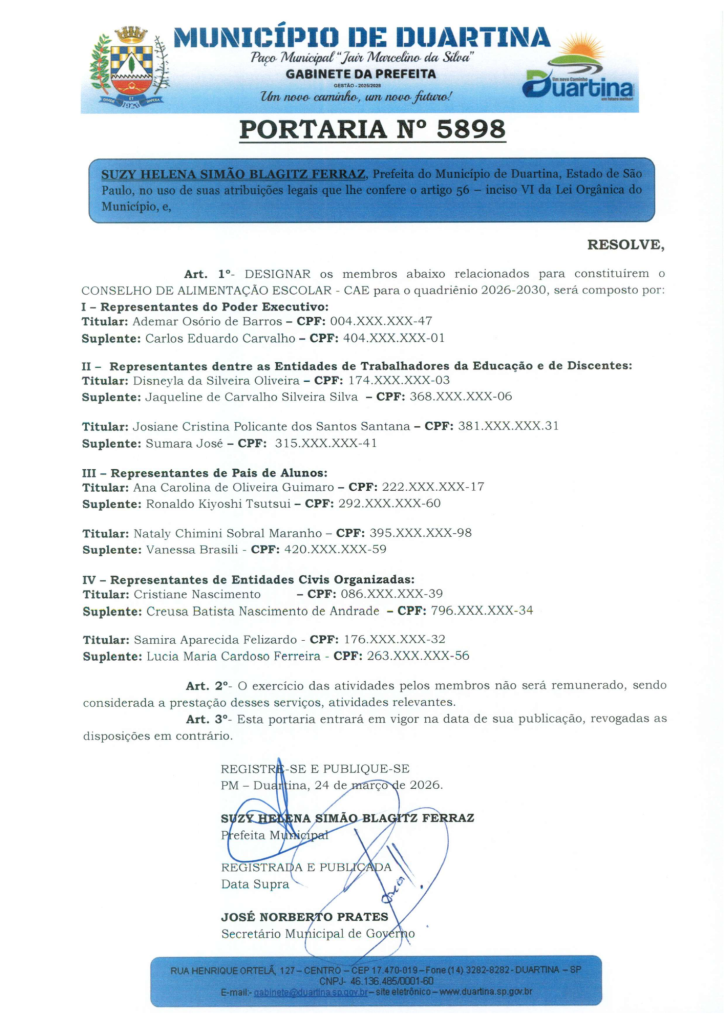 Portaria 5898 do Conselho de Alimentação Escolar (CAE)