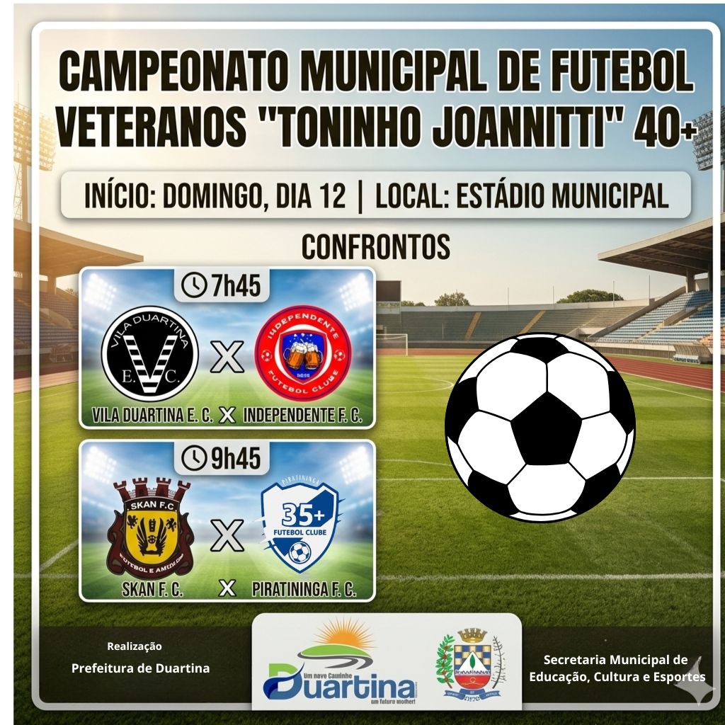 A Prefeitura de Duartina, por meio da Secretaria Municipal de Educação, Cultura e Esportes, realiza no domingo (12), a abertura do Campeonato Municipal de Futebol Veteranos “Toninho Joannitti” 40+, promovendo a valorização do esporte e incentivando a integração entre atletas do município.