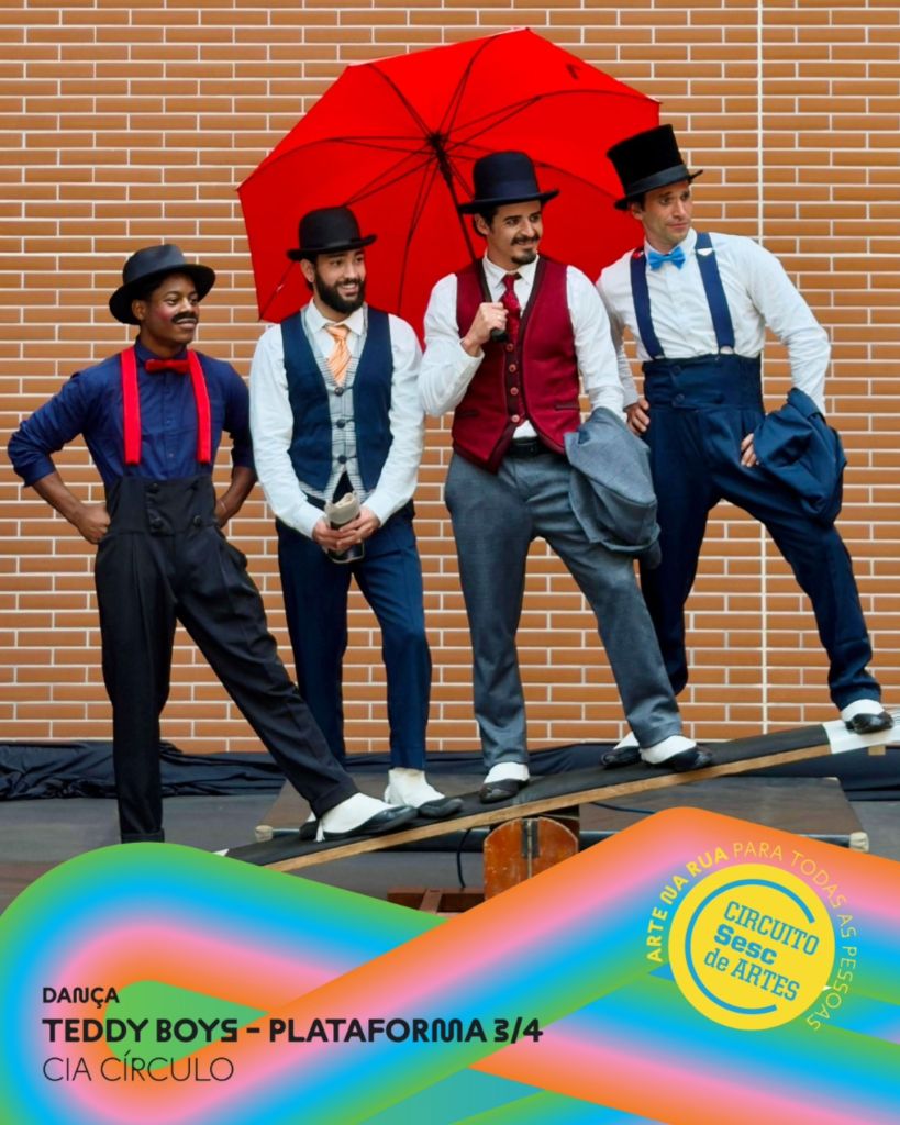 Na dança, a Cia Círculo apresenta Teddy Boys – Plataforma 3/4, uma intervenção urbana que transforma o espaço público em palco por meio de humor, música e acrobacias, criando momentos surpreendentes entre artistas e espectadores.