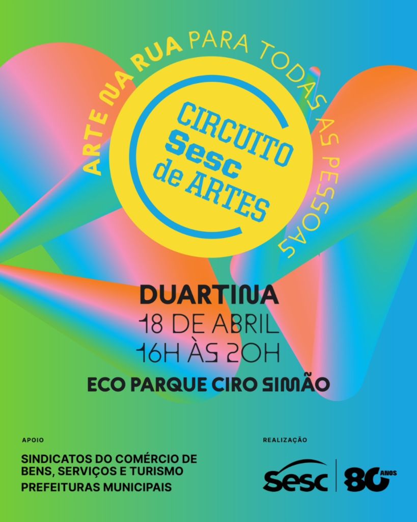 A Prefeitura de Duartina, em parceria com o Sesc São Paulo, convida toda a população para participar do Circuito Sesc de Artes 2026, que acontece neste sábado (18) das 16h às 20h no Eco Parque Ciro Simão, com uma programação gratuita e diversificada voltada para públicos de todas as idades.
