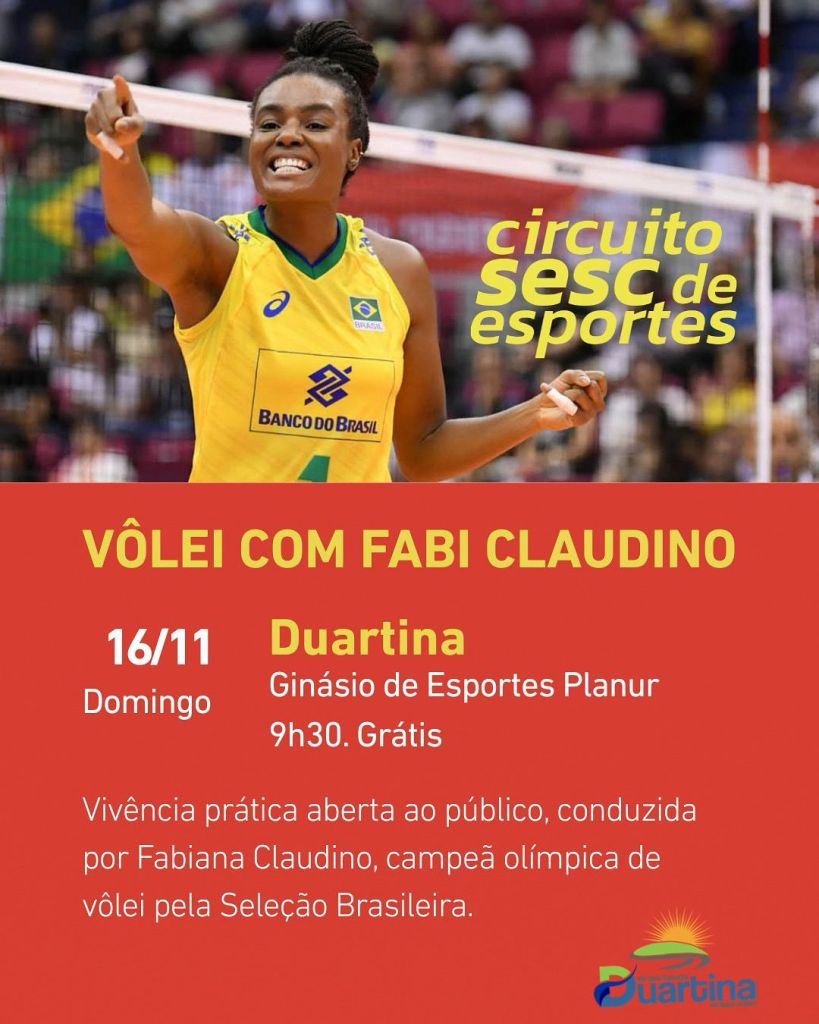 Duartina será palco de um grande encontro esportivo neste domingo (16), com a presença da campeã olímpica Fabiana Claudino, ícone da Seleção Brasileira de Vôlei. A atleta conduzirá uma vivência prática de vôlei aberta ao público, dentro da programação do Circuito Sesc de Esportes. O evento acontecerá no Ginásio de Esportes Planur, a partir das 9h30, com entrada gratuita.