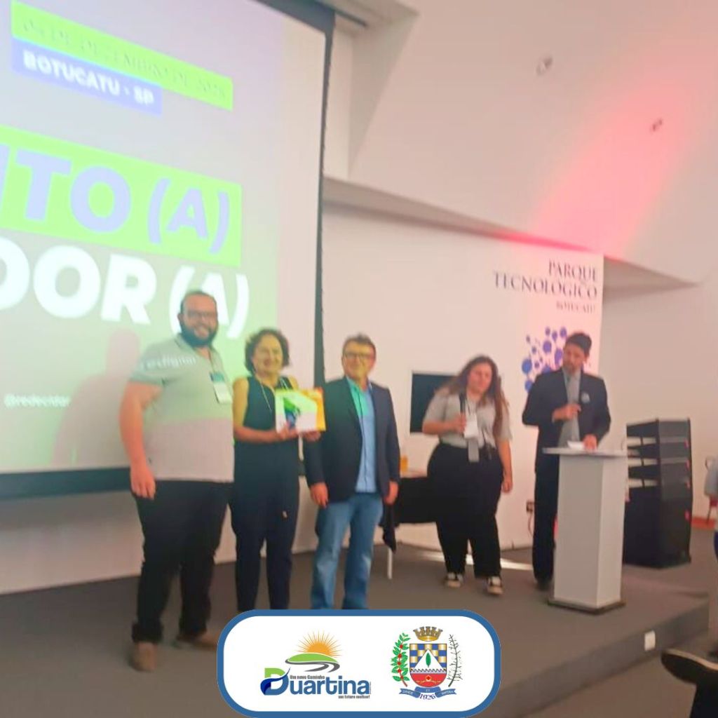 Suzy esteve acompanhada do esposo e primeiro-cavalheiro, Paulo Sérgio, e do secretário municipal de Meio Ambiente e Agricultura, Pedro Duarval. O reconhecimento reforça o trabalho da administração de Duartina em modernizar processos e aprimorar o atendimento à população por meio da tecnologia.