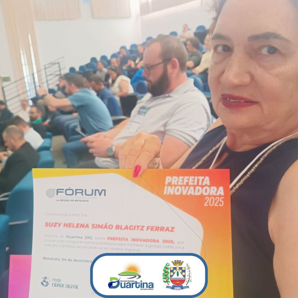 A prefeita Suzy Simão recebeu nesta quinta-feira (4) o título de Prefeita Inovadora 2025 durante o Fórum de Cidades Digitais e Inteligentes, realizado no Parque Tecnológico de Botucatu, por meio da Rede Cidade Digital (RCD).