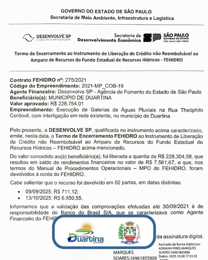 A regularização consta no Termo de Encerramento do Instrumento de Liberação de Crédito não Reembolsável do FEHIDRO, contrato nº 275/2021, firmado com a Desenvolve SP – Agência de Fomento do Estado de São Paulo. O contrato teve valor total aprovado de R$ 228.754,01 e teve como objeto a execução de galerias de águas pluviais na Rua Theóphilo Cordovil, com interligação à rede existente, no município de Duartina.