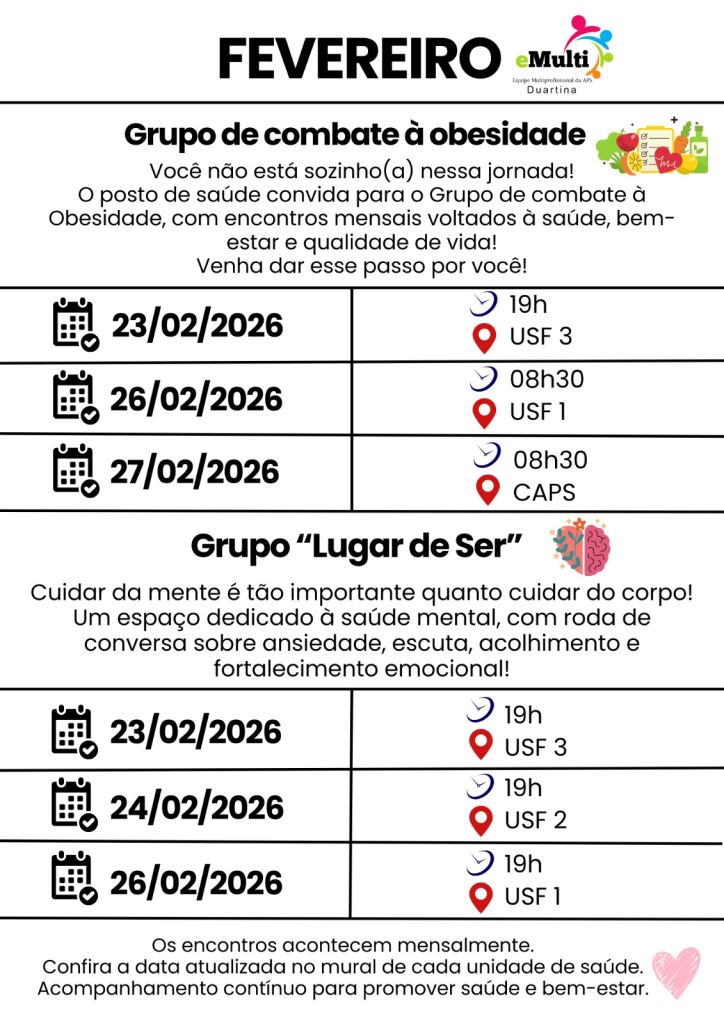 A Prefeitura de Duartina, por meio da Secretaria Municipal de Saúde, em parceria com a eMulti – Equipe Multiprofissional, convida a população a participar dos encontros de promoção da saúde e do bem-estar, com ações voltadas ao cuidado do corpo e da mente
