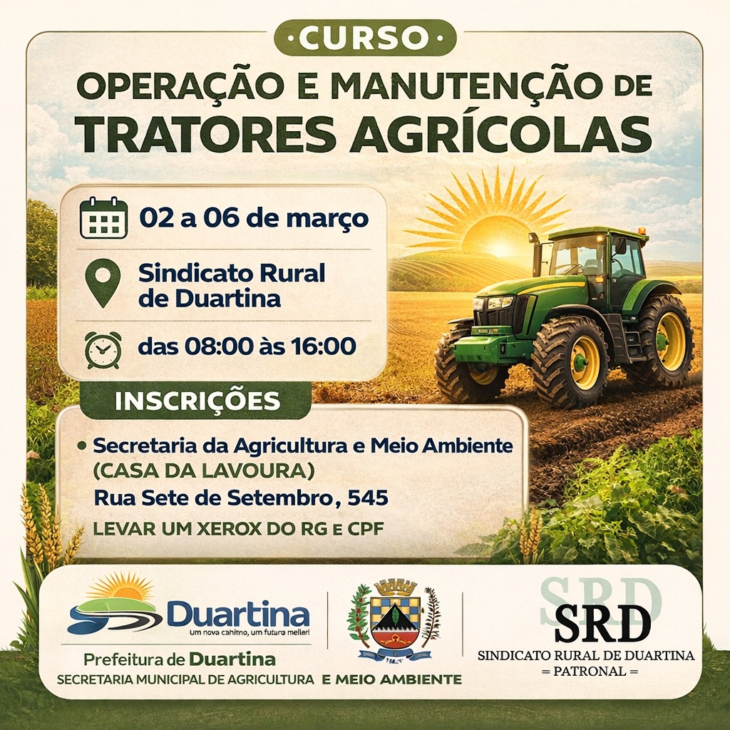 A Prefeitura de Duartina, por meio da Secretaria Municipal de Agricultura e Meio Ambiente, informa que estão nos últimos dias as inscrições para o Curso gratuito de Operação e Manutenção de Tratores Agrícolas. Ao todo, são disponibilizadas apenas 15 vagas.